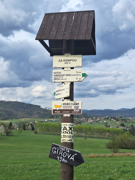 Święta Wielkanocne w tym roku w dobrą pogodę owocne. Trzeba spalić te serniki itd...wtedy najlepiej iść do przyrody. Pomysł padł na Girovą w Beskidzie Śląskim 840 m.n.p.m. szczyt wznoszący się na wschód od Przełęczy Jabłonkowskiej, tam jakoś dość często i chętnie się wędruje. Wybrało się koleżeństwo polsko- słowackie na teren Czech i jako, że to był Lany Poniedziałek tak też spora grupka dzieci stojąca przy drodze z pełnymi wiaderkami i butelkami dosłownie umyła samochód. Całe szczęście, że okna były zamknięte , a radość była wielka nawet po obu stronach. W Chacie Girovej pełno turystów, piwko pyszne lane jak i ten Poniedziałek. Na szczycie poczyniliśmy zdjęcie z banerem i ruszyliśmy w kierunku Diablich Skał. Następnie odwiedziliśmy najbardziej wysunięty na wschód punkt Republiki Czeskiej, a tam ciekawa ścieżka edukacyjna i piękny zakątek natury. Dobry to był dzień.